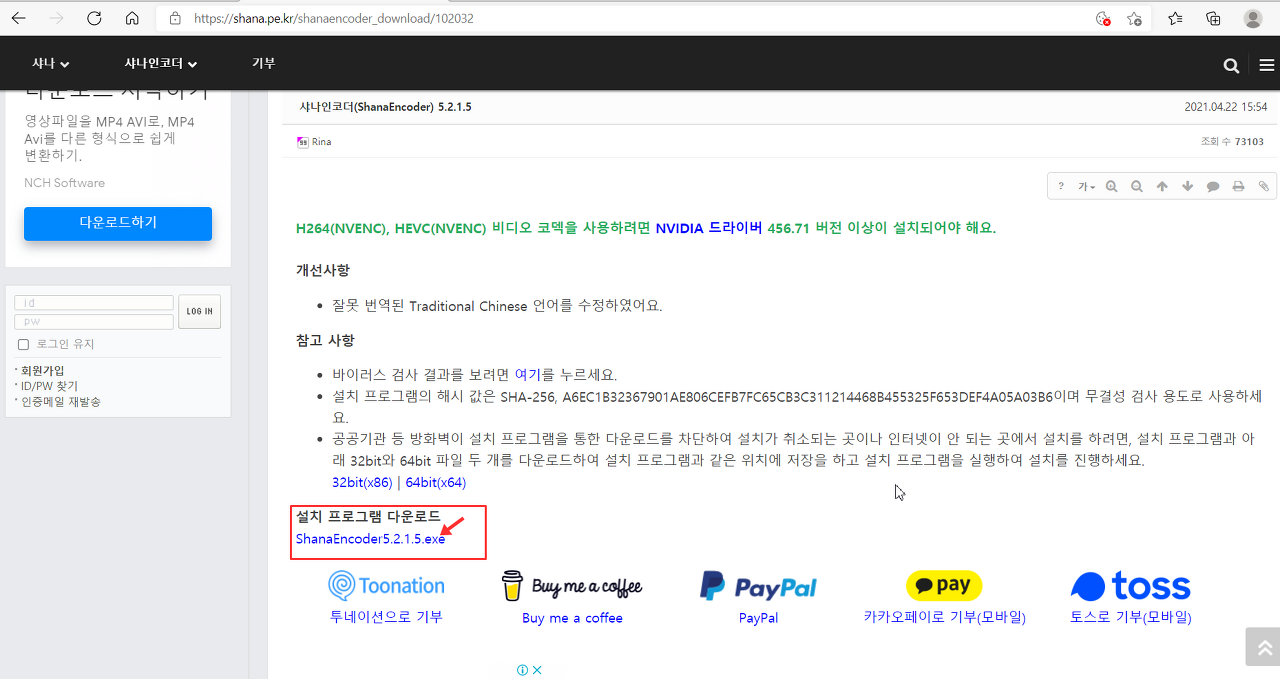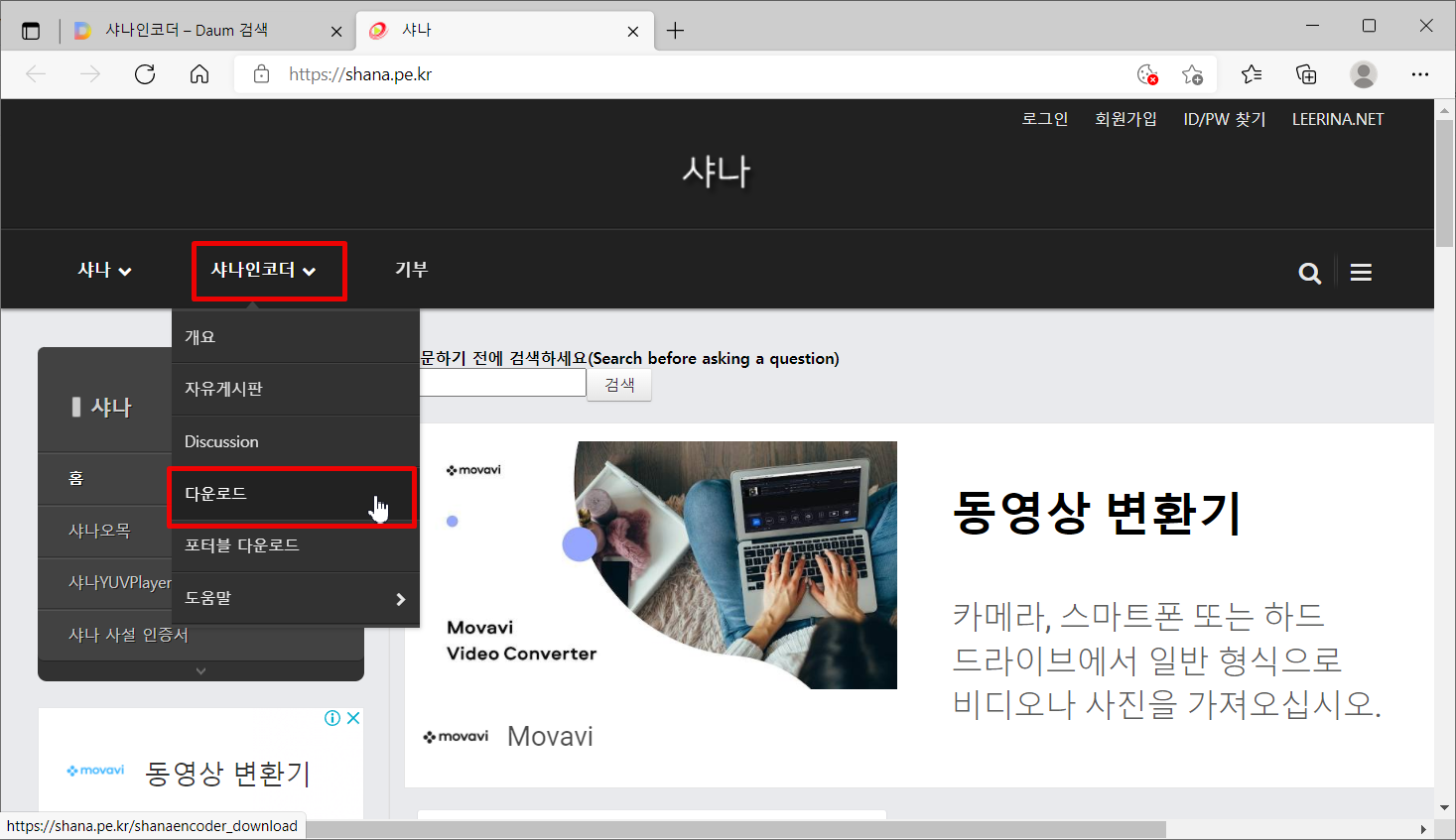 위에 그림과같이 상단에 샤나인코더 -> 다운로드 를 눌러주세요.