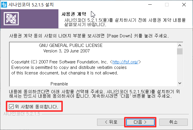 그럼 이런창이 나오는데 "위 사항에 동의합니다." 체크하고 다음 눌줍니다.