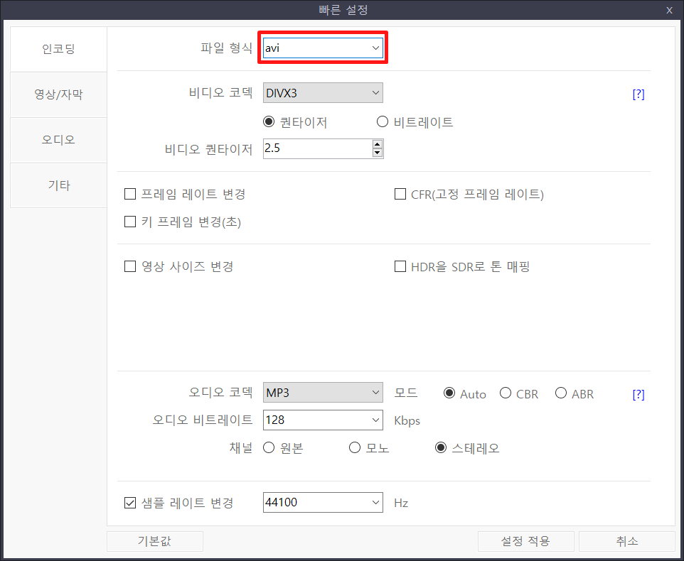 빠른 설정 창이 뜨면 avi 를 눌러주세요.