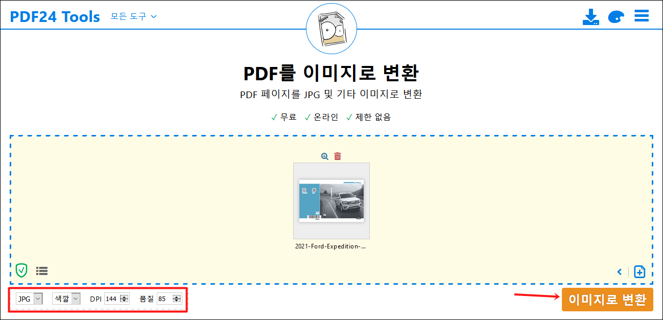 무료로 사용할 수 있고 간단한 몇 번의 클릭만으로 pdf파일을 jpg파일로 변환 할 수 있습니다.