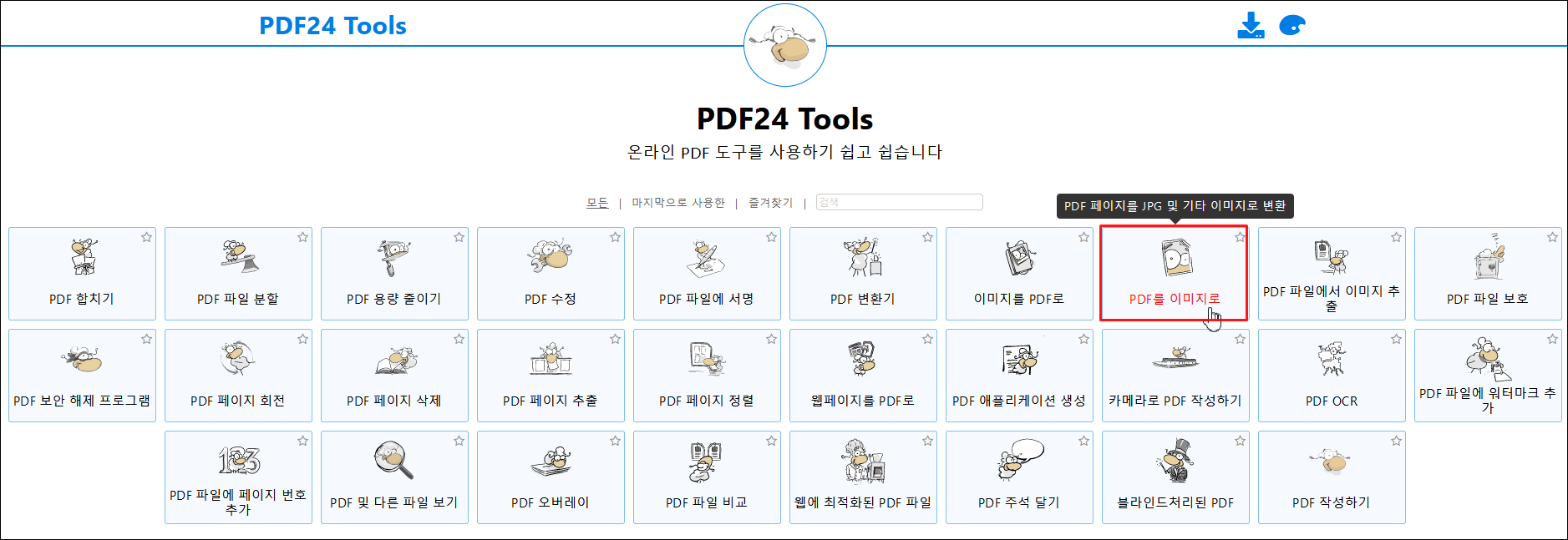 접속하면 이런 메인 화면이 나오는데 [PDF를 이미지로] 클릭해주세요.