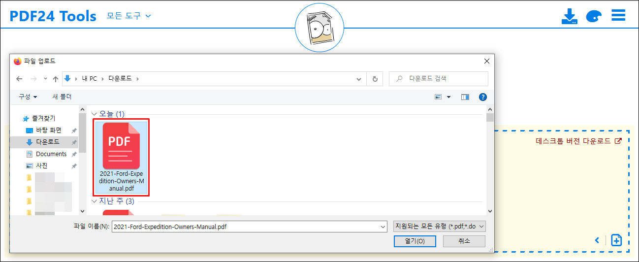 파일선택을 누르면 위에 그림과같이 파일 업로드 창이 열리는데, pdf 파일을 선택합니다.