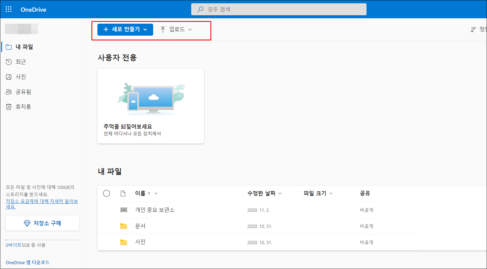 상단에 보시면 "새로 만들기" , "업로드" 보이시죠?