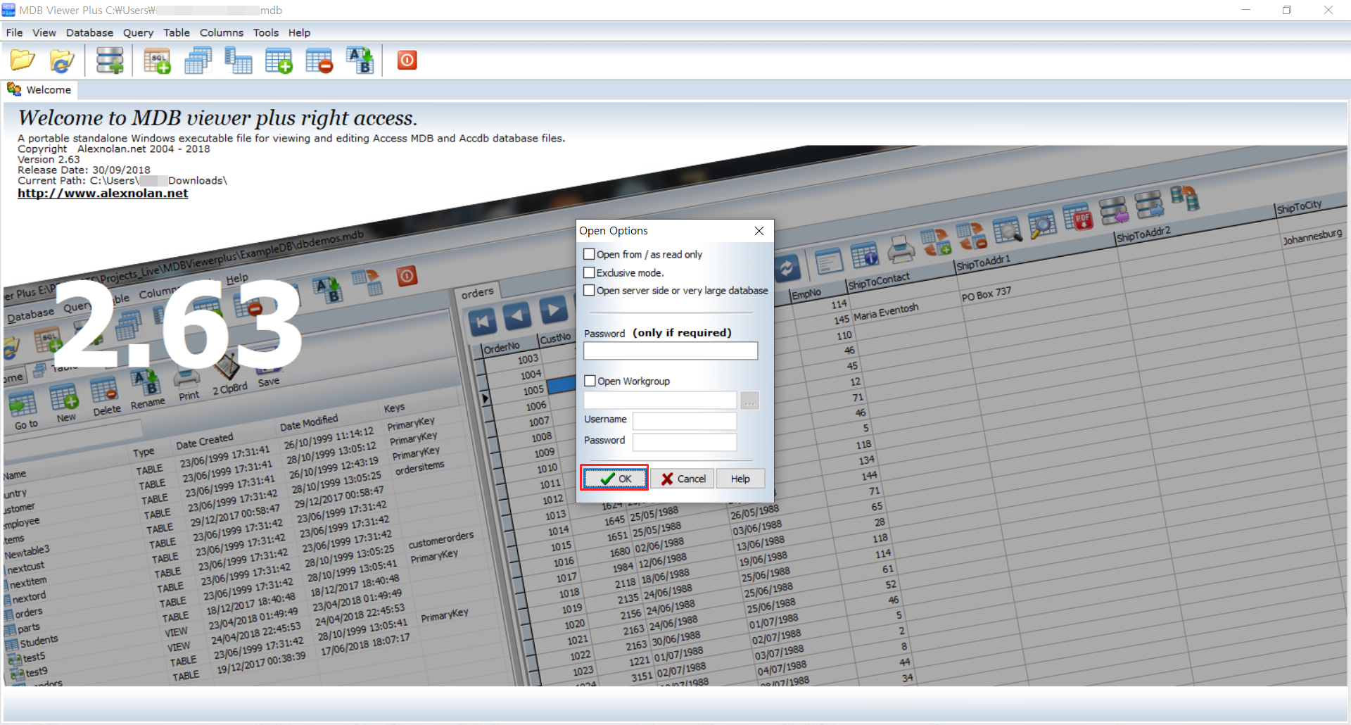 MDB Viewer Plus를 사용하여 Access를 설치하지 않고 MDB 파일과 Accdb 파일을 열 수 있습니다. 또한 열린 옵션에 지정된 경우 작업 그룹 파일도 사용합니다. 열린 옵션을 사용하여 작업 그룹 파일(MDW)을 지정할 수 있습니다.