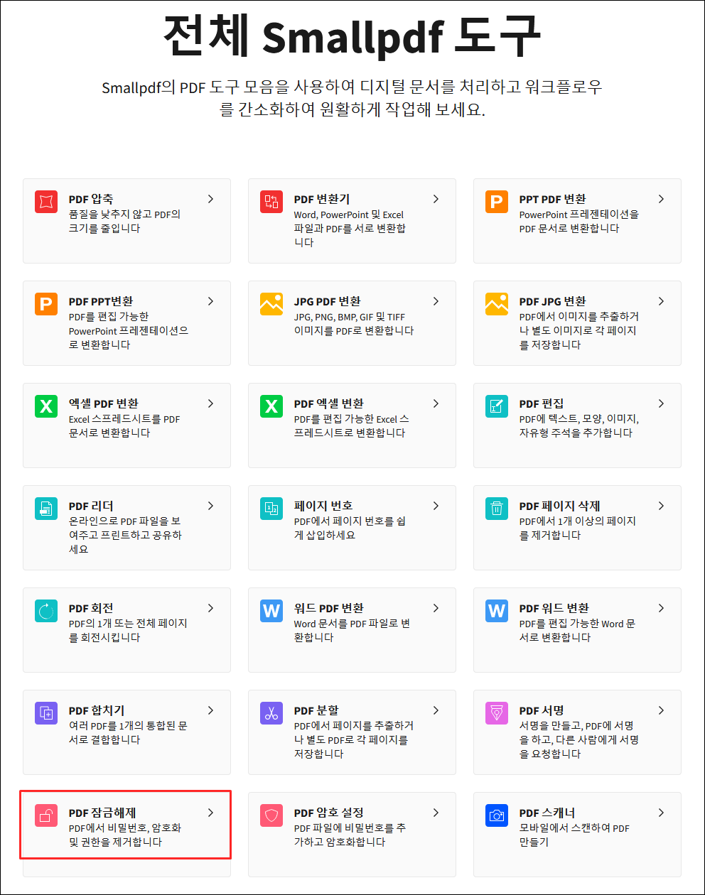 Smallpdf의 장점은 PDF파일 비밀번호 해제 뿐만아니라 PDF 암호 설정, pdf합치기/pdf분할/pdf 워드, 엑셀 이미지로 변환 등등 가능하다는 점입니다. 프로그램 설치나 로그인 필요없고 쉽게 PDF파일 비밀번호 해제 가능합니다.
