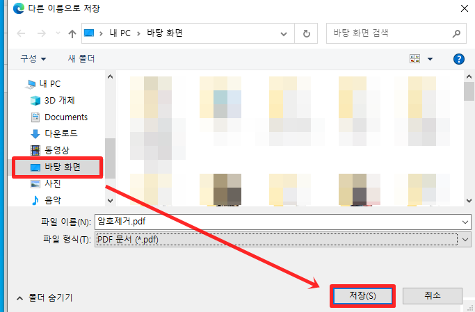 다른 이름으로 저장 창이 뜨면 저장위치는 찾기쉽게 바탕화면으로 하고 저장을 눌러 주세요.