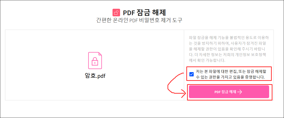 잠금을 해제할 파일을 올리고 체크박스에 동의를 하고 [PDF 잠금해제]를 눌러주시면 작업이 진행됩니다.