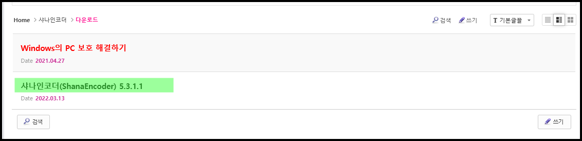 위에 링크로 들어간후 형광펜으로 칠한 "샤나인코더(ShanaEncoder) 5.3.1.1" 게시물을 클릭해주세요.