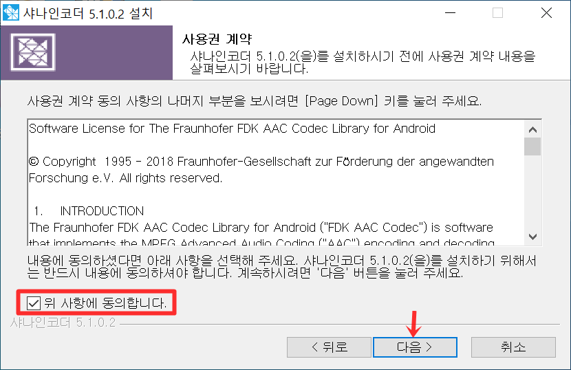 사용권 계약 내용이 뜹니다. 하단에 [위 사항에 동의합니다] 체크하고 [다음]을 클릭합니다.