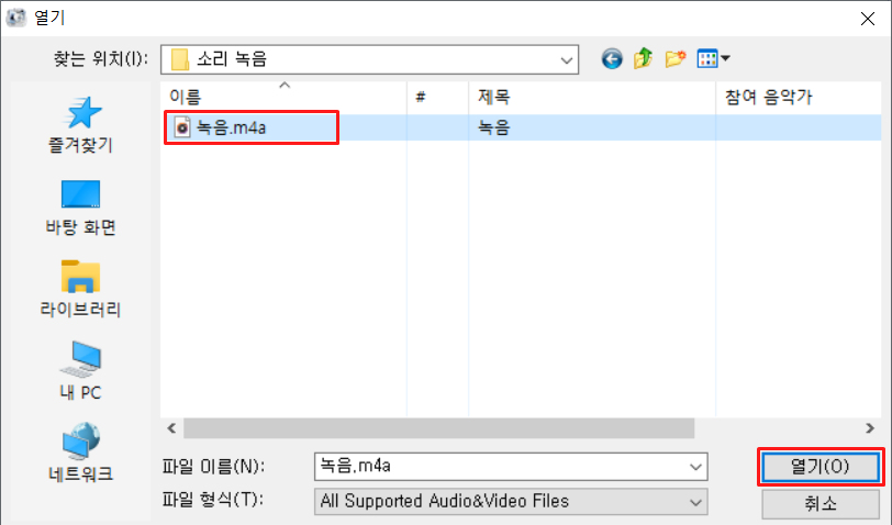 파일 추가를 누르면 이미지와 같은 창이 나오게 되는데, M4A 파일이 있 폴더로가서 선택후 열기를 눌러주세요.