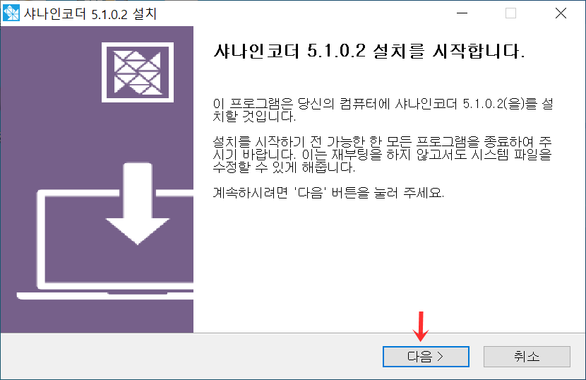 설치시작 화면이 뜨면 [다음]을 클릭합니다.