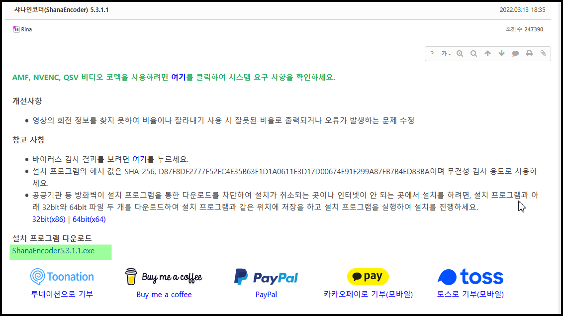 본문에 보시면 위에 같이 설치 프로그램 다운로드 밑에에 형광펜으로 칠한 ShanaEncoder5.3.1.1.exe 를 클릭해서 다운받습니다.