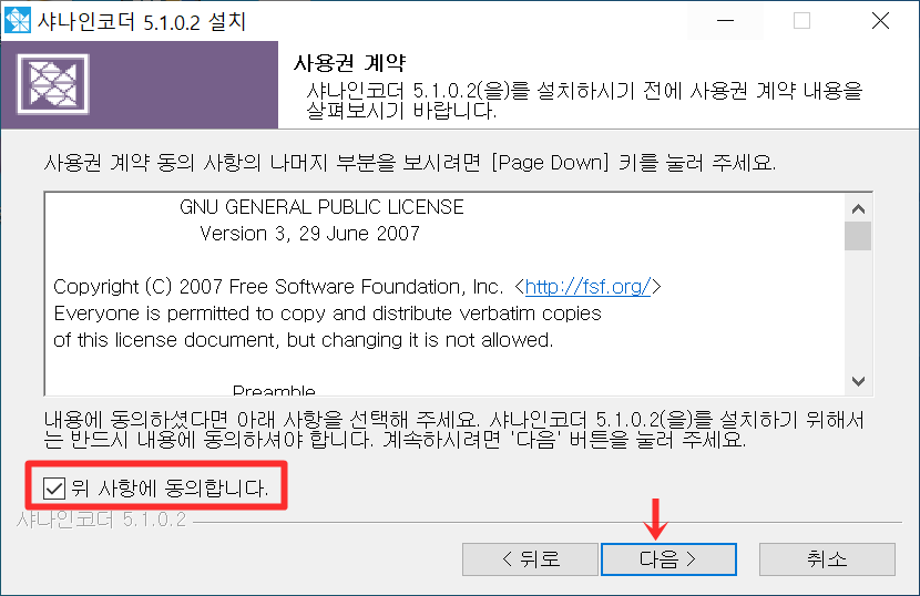 하단에 [위 사항에 동의합니다] 체크하고 [다음]을 클릭합니다.