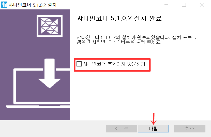 설치가 완료되면 "샤나인코더 홈페이지 방문하기" 체크해제 후 [마침]을 클릭합니다.