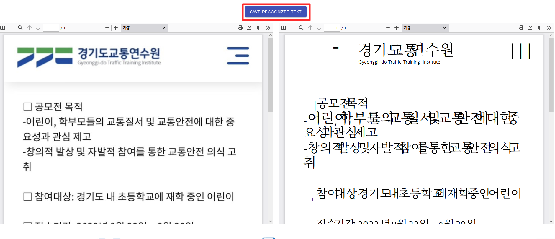 완료되면 요런화면이 나옵니다. SAVE RECOGNIZED TEXT 눌러 주면 TXT 파일로 받을을 수 있습니다..