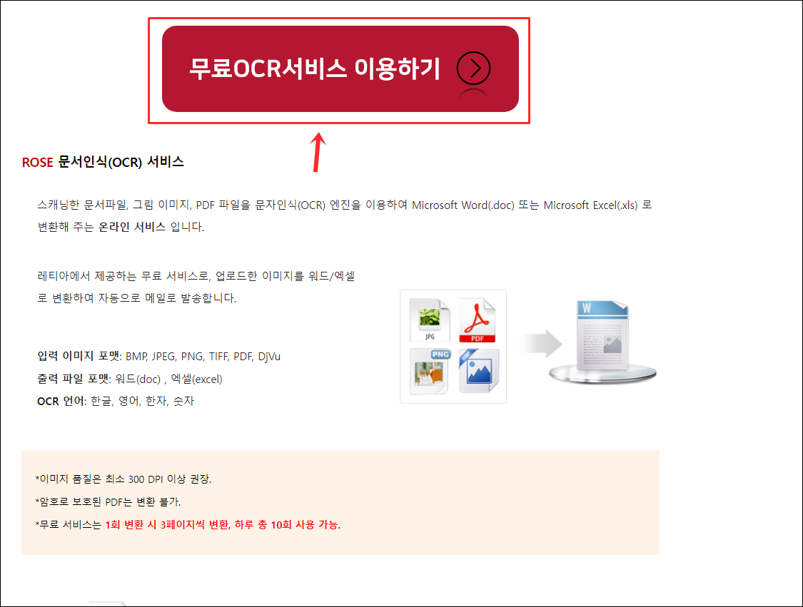 스캐닝한 문서파일, 그림 이미지, PDF 파일을 문자인식(OCR) 엔진을 이용하여 Microsoft Word(.doc) 또는 Microsoft Excel(.xls) 로 변환해 주는 온라인 서비스 입니다.