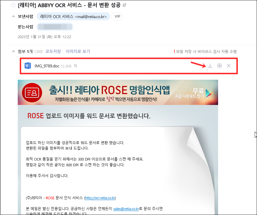 메일 확인 레티아 OCR서비스 에서 보낸 메일이 도착했을거에요.