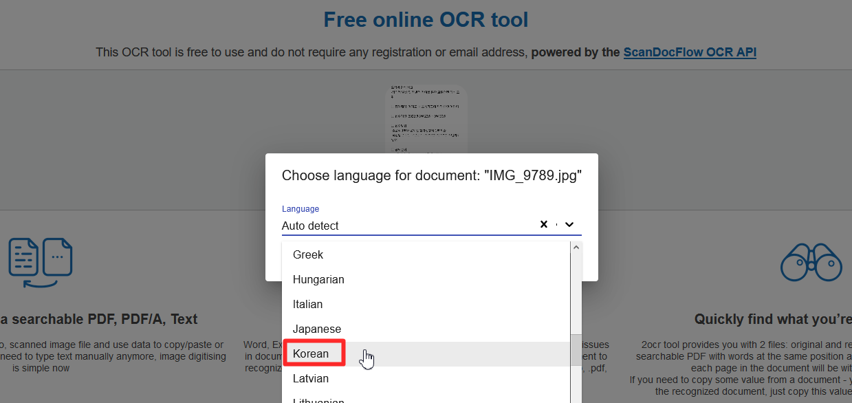이미지를 불러오면 위와같이 Choose language for document: 창이 뜰거에요.