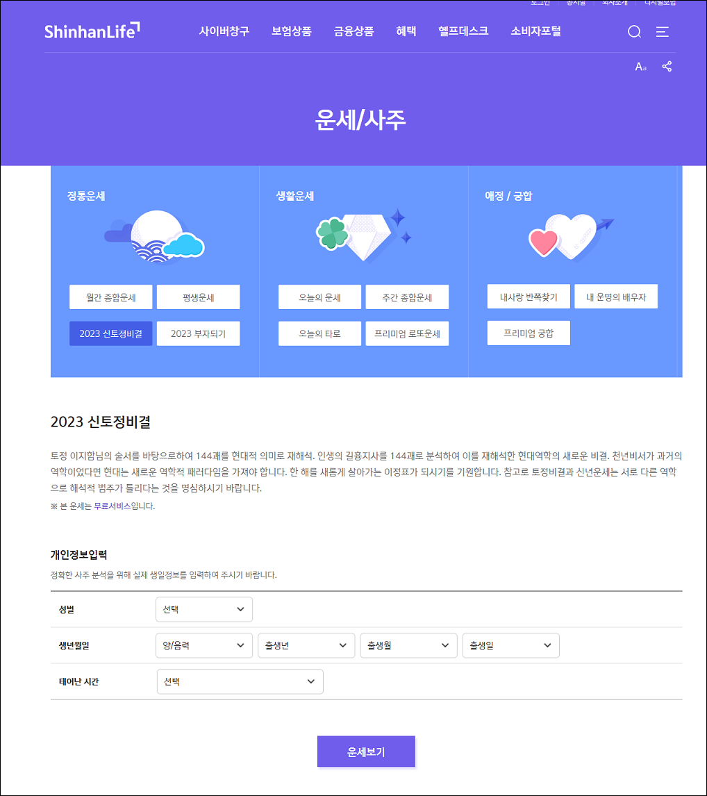 2023년 신한생명 신년무료 토정비결 무료운세 보는방법
