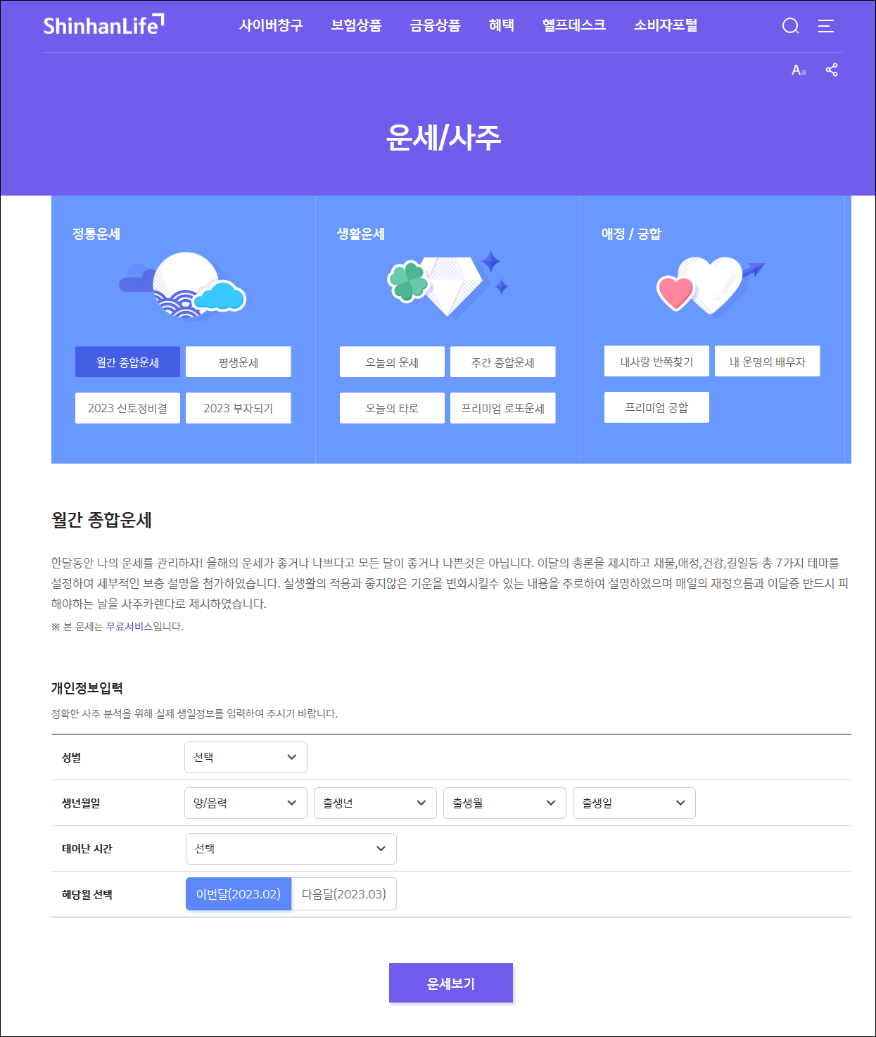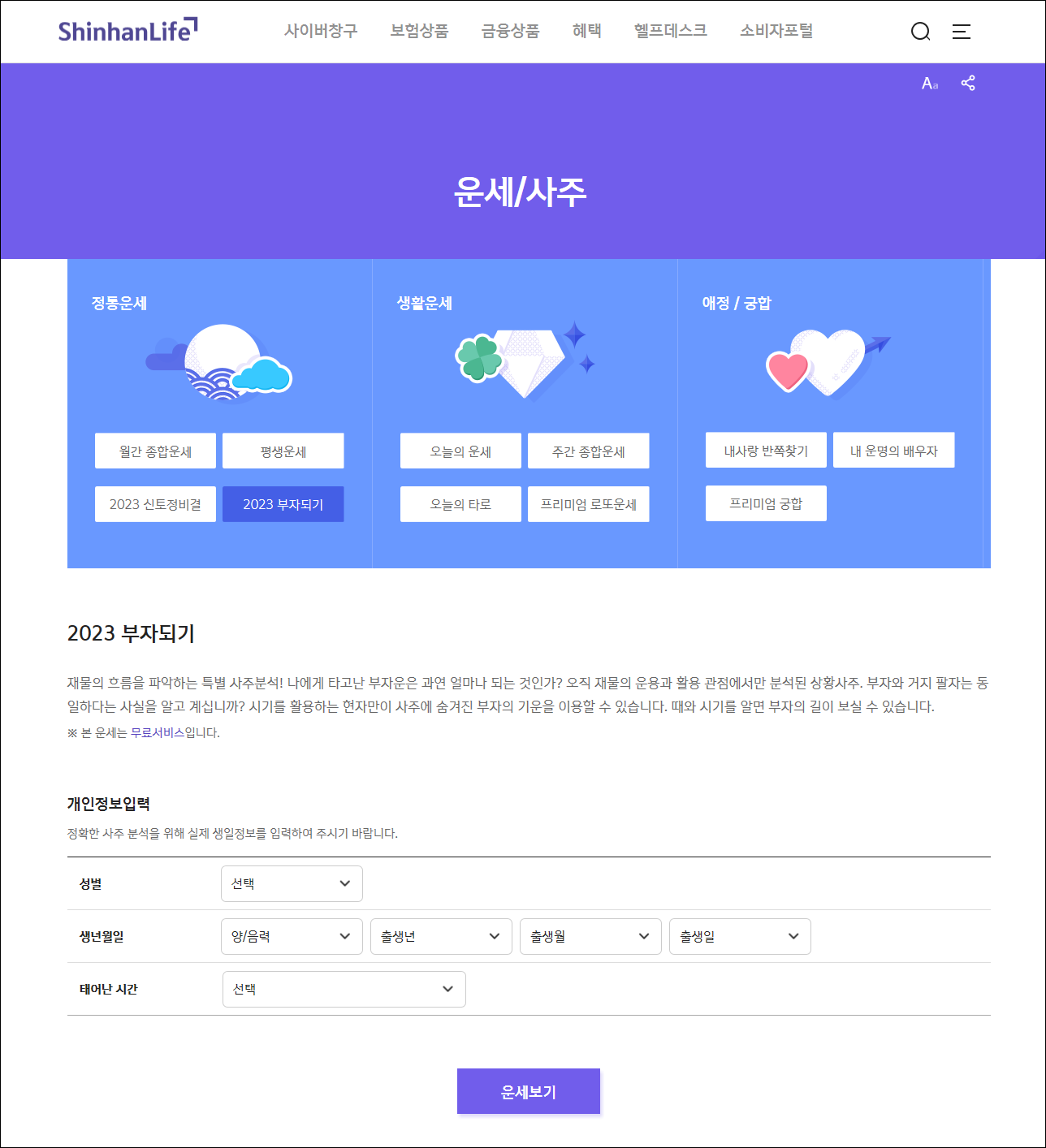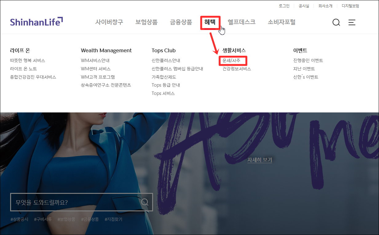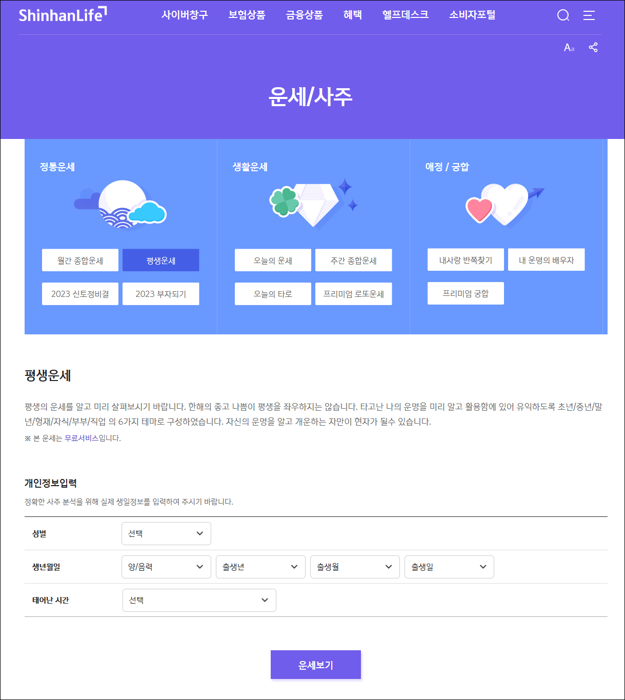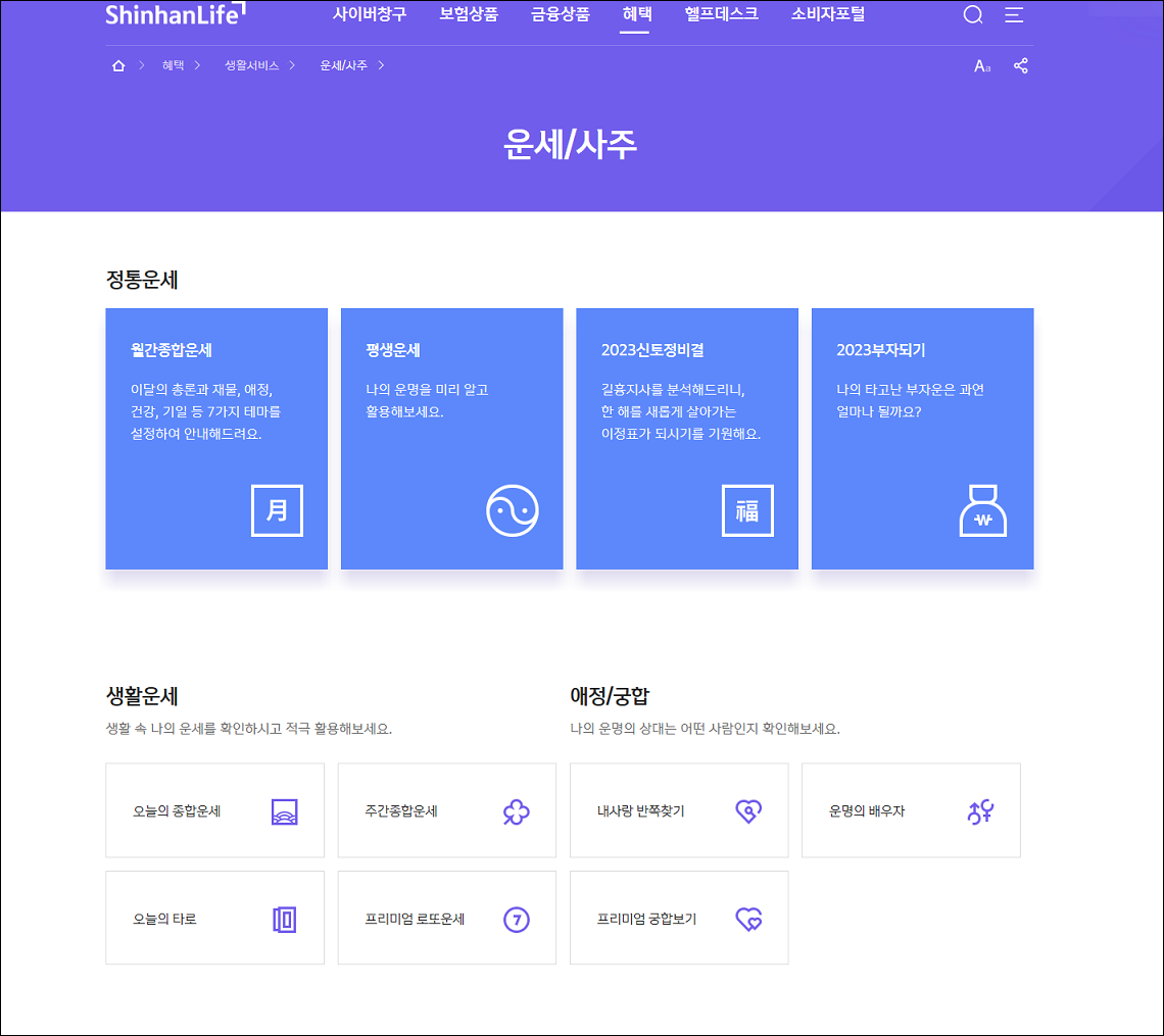 Daum에서 신한생명 홈페이지 치고 들어가서 혜택 메뉴 밑에 생활서비스 세부메뉴에서 본 운세/사주가