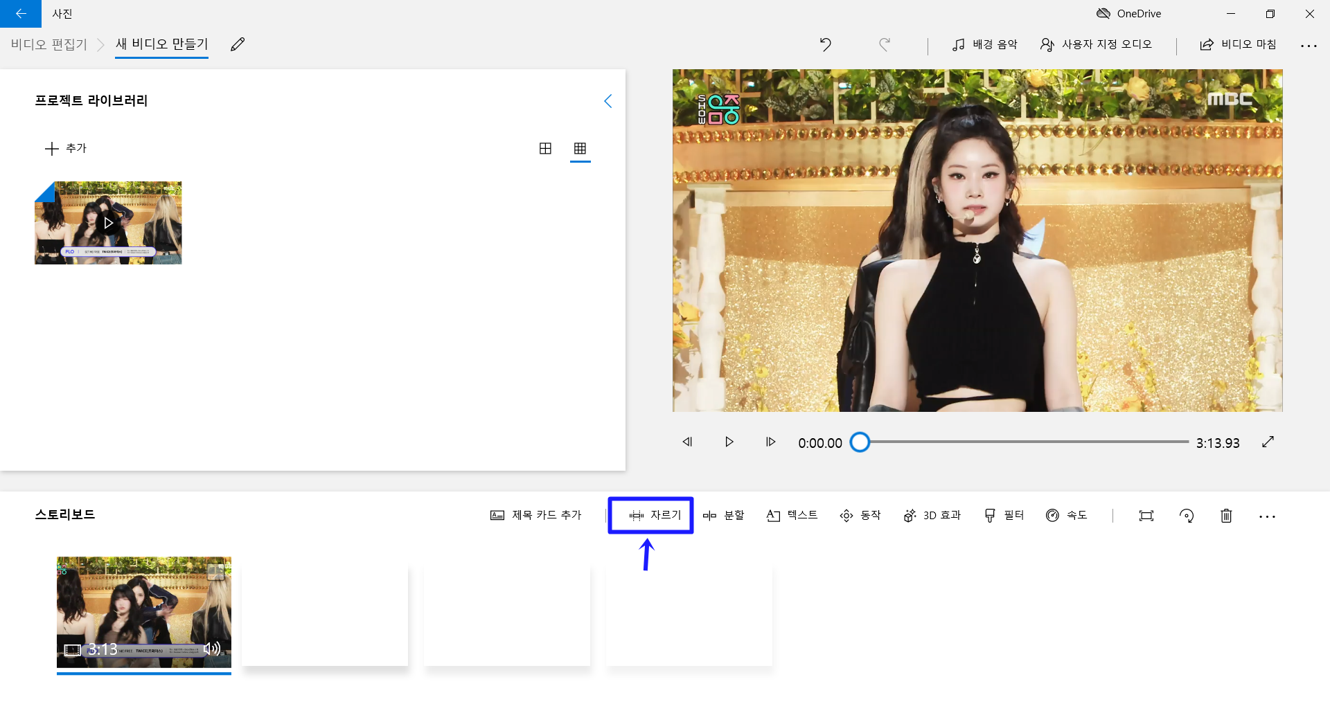 비디오 편집기 를 실행 하면 위와같은 화면이 뜨는데