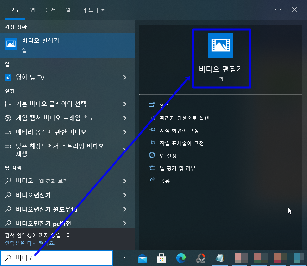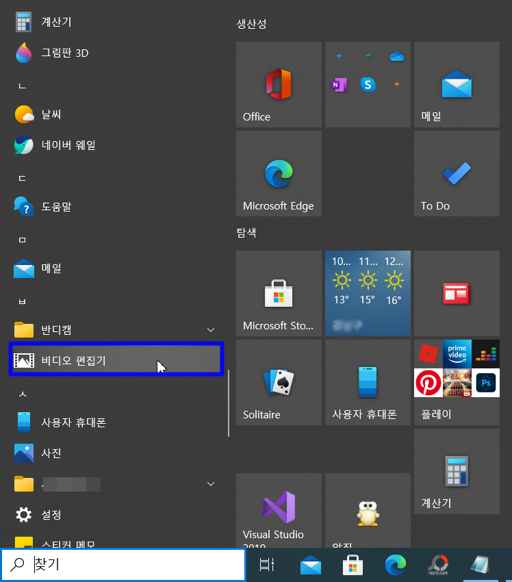 또는 시작 누르고 스크롤바롤 아래쪽으로 내려보시면 비디오 편집기 보이는데 여기서 실행해도됩니다.