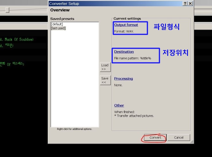 6.그럼 위와같은 창이 뜨는데 Output format 를 눌러 파일 형식 설정하고, Destination 을 눌러 리핑 한 곡들 저장할 폴더 지정후 Convert 눌러주면 변환이 됩니다.