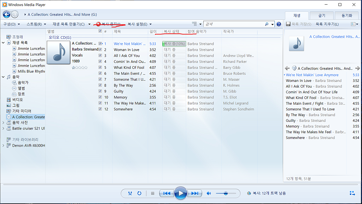 윈도우 미디어 플레이어에서 하면 장점이 앨범이름과 곡제목이 자동으로 들어가서 좋습니다