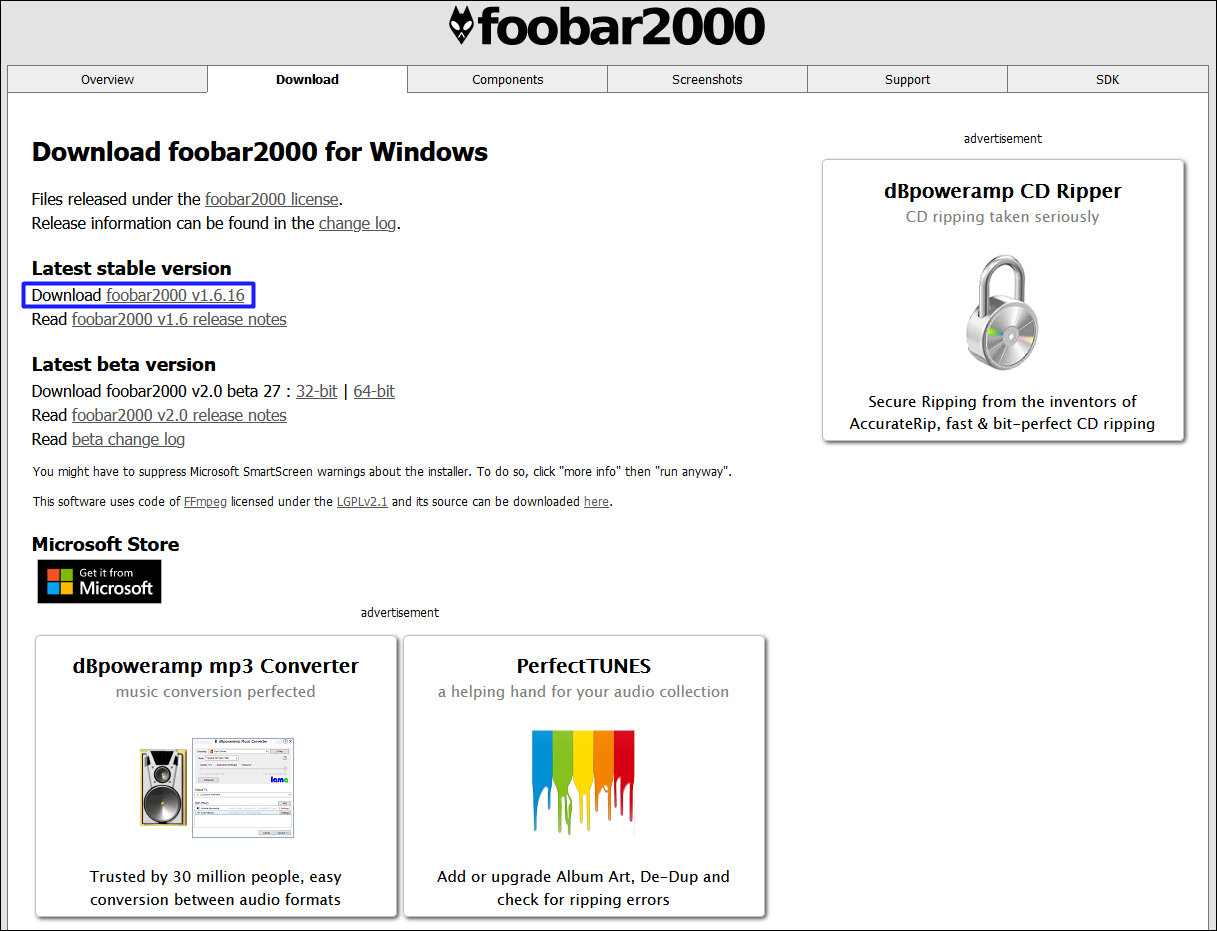 Latest stable version 밑에 foobar2000 링크를 눌러 다운받으시면됩니다.