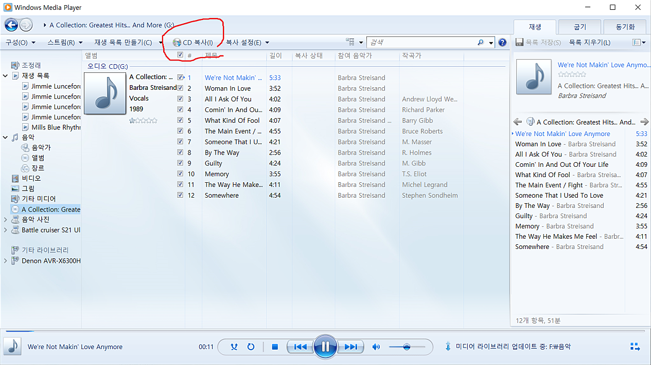 그럼 현재 들어가있는 CD의 음악들이 목록에 뜹니다.