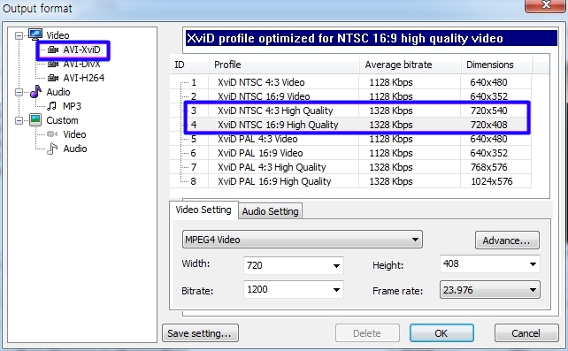 Video 를 선택하신 후.. AVI-Xvid, AVI-Divx, AVI-H264 중 아무거나 선택하세요.