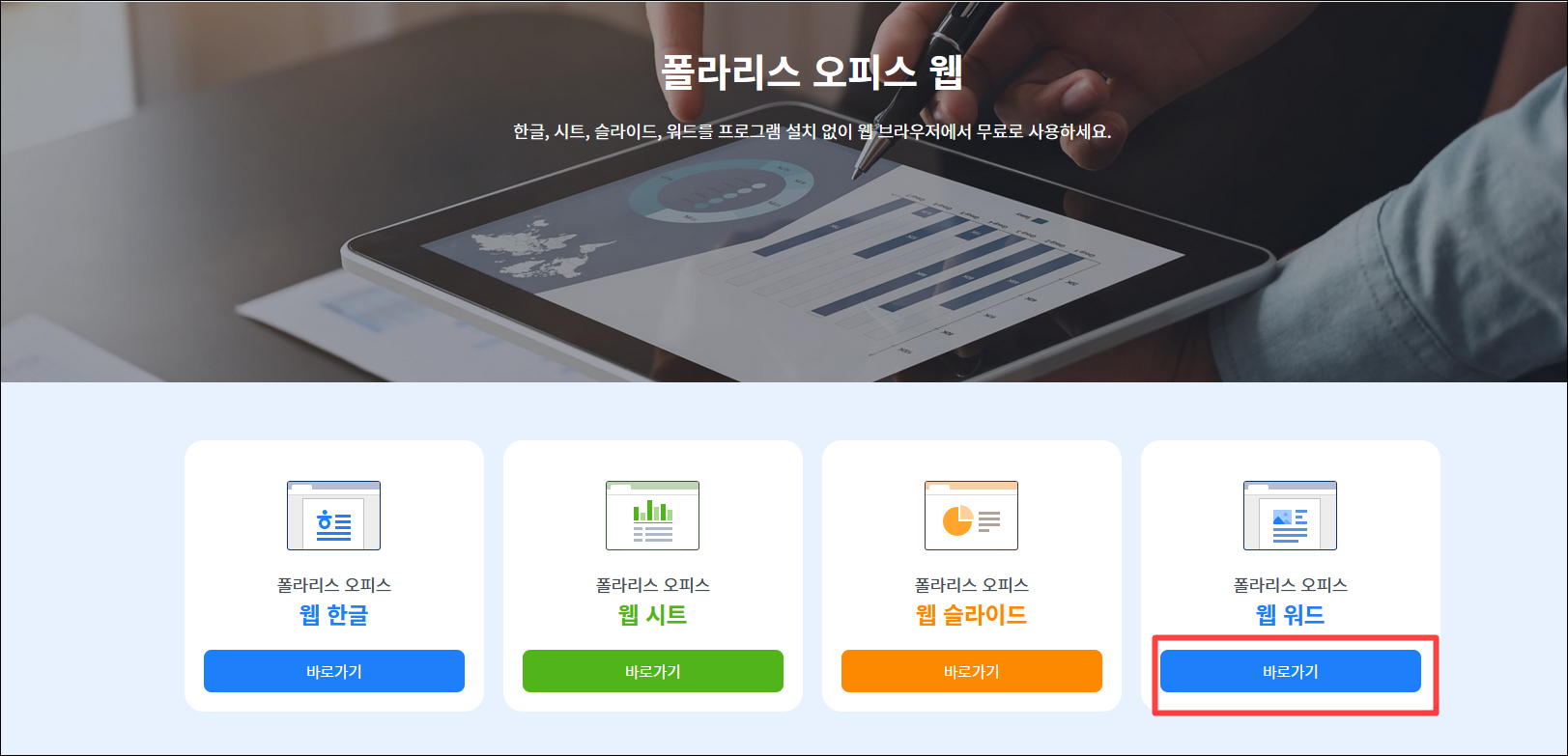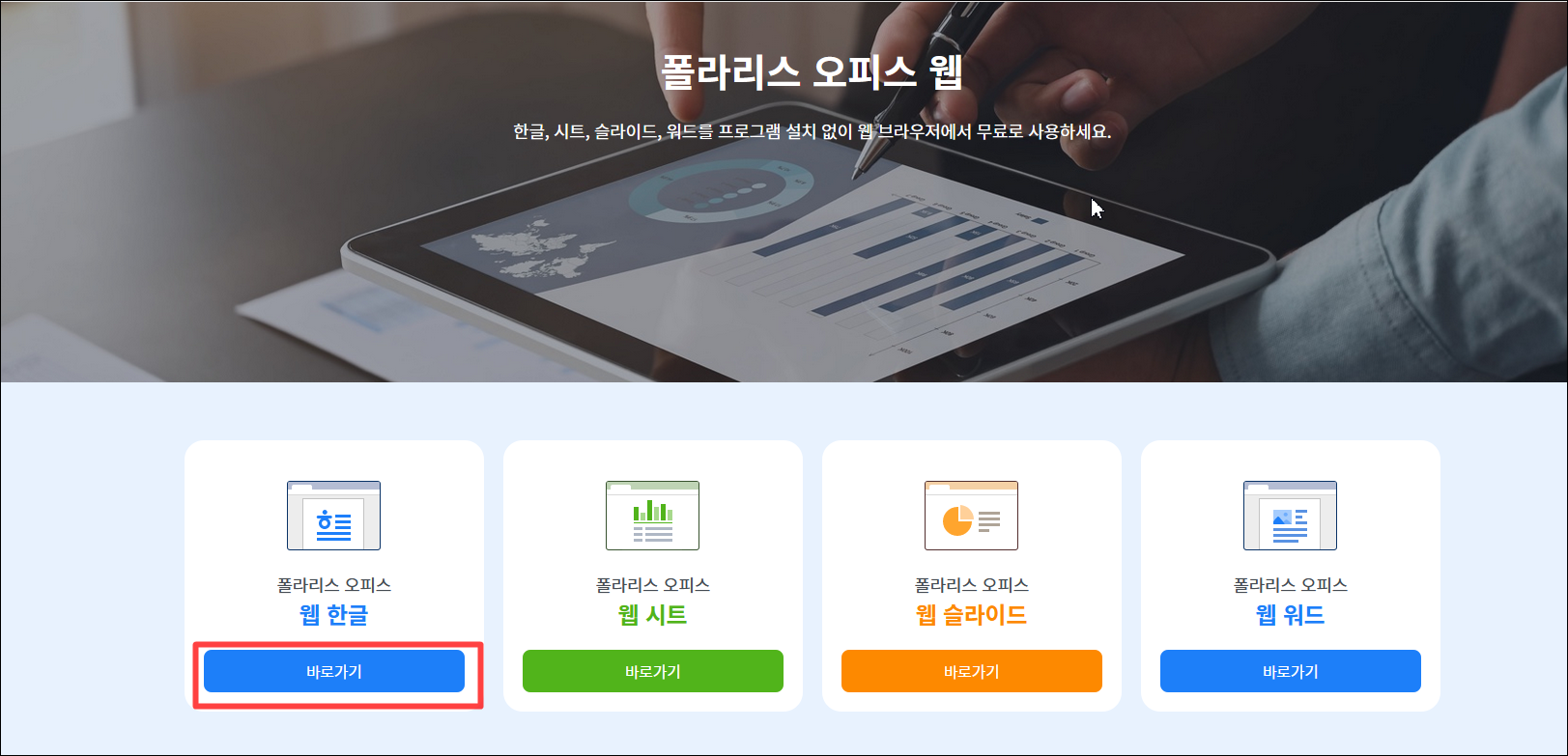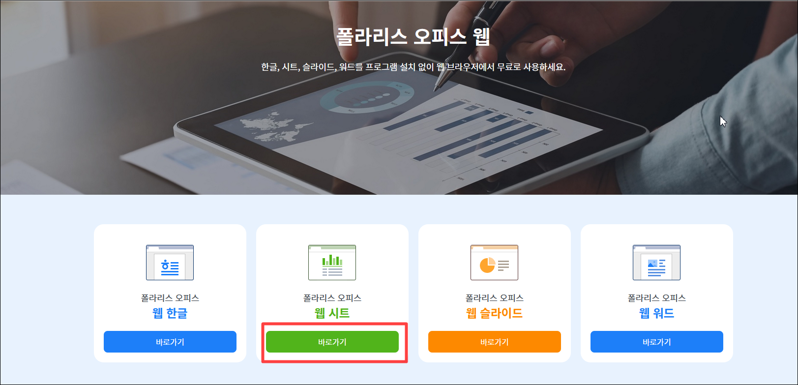 바로 접속하시려면 https://www.polarisoffice.com/ko/personal/officeweb 여기를 클릭해서 들어가주세요 :)