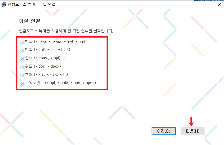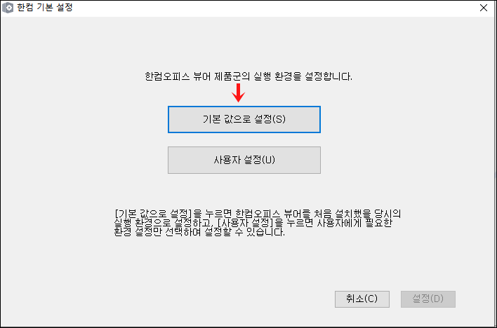 한글뷰어 설치 완료 설정 버튼을 눌러주세요.