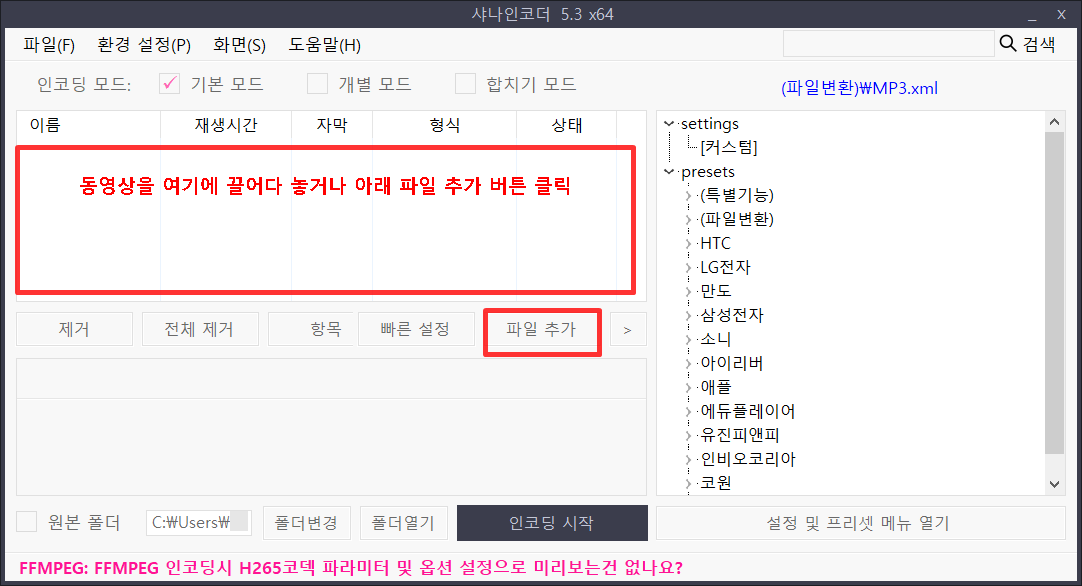 여러가지 동영싱 인코딩 프로그램이 있는데 샤나인코더 사용하기 편하구요