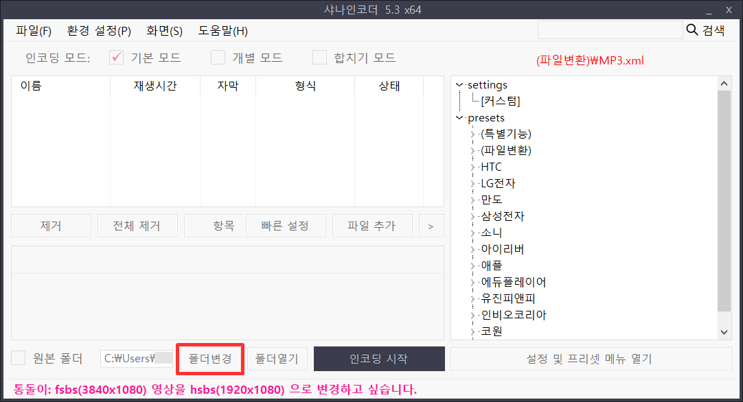 그리고 메인 화면 하단에 "폴더 변경" 버튼을 눌러 파일 저장할 위치를 지정해줍니다.