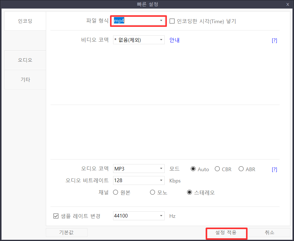 mp4로 변경후 우측하단에 "설정 적용" 버튼을 눌러주세요.
