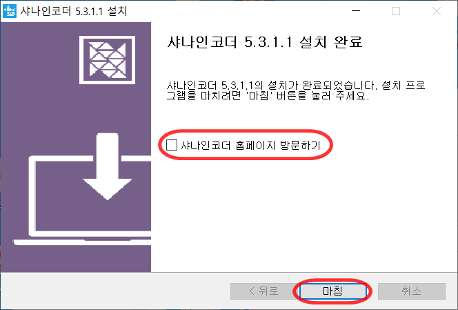 완료되면 요런화면이 나오는데 샤나인코더 홈페이지 방문하기 체크해제후 마침 버튼을 눌러주세요.