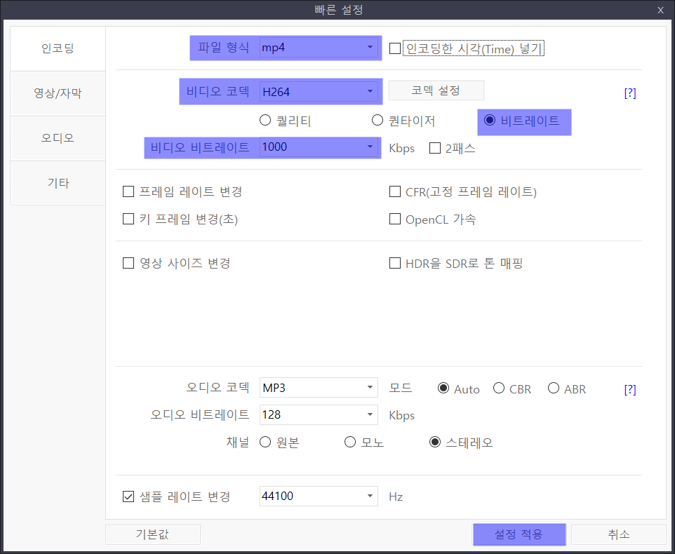 그런다음 비디오 비트레이트 1000으로 설정 하고 적용 버튼을 눌러주세요.