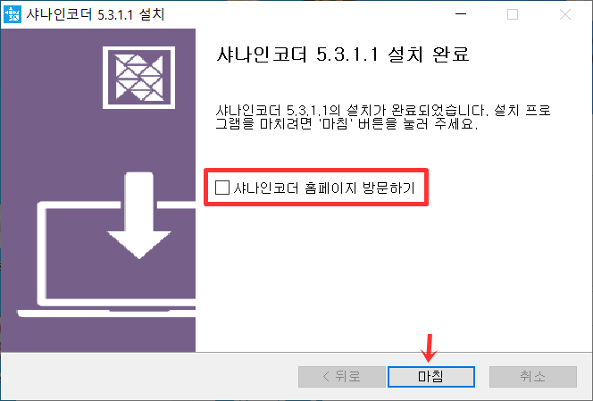설치 완료되었으면 저기 "샤나인코더 홈페이지 방문하기" 체크해제후 마침 버튼을 눌러주세요.