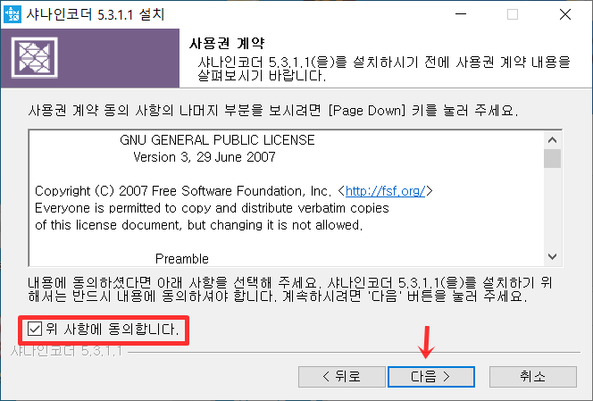 왼쪽하단에 [위 사항에 동의합니다.] 항목 체크후 다음 버튼을 클릭해주세요.