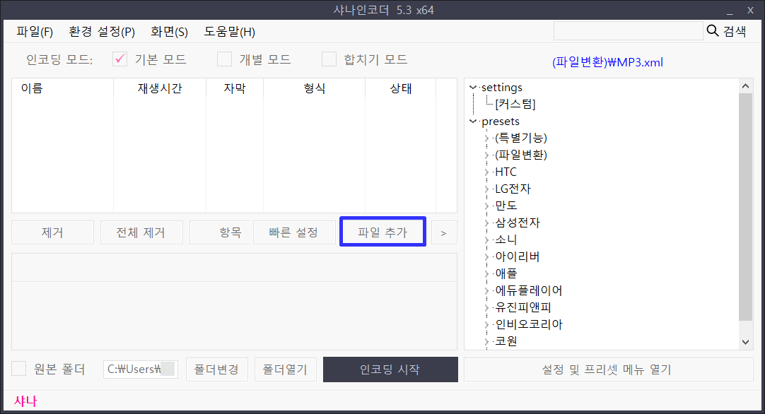 샤나인코더 실행 모습입니다., 파일 추가 를 눌러 동영상 파일을 불러옵시다.