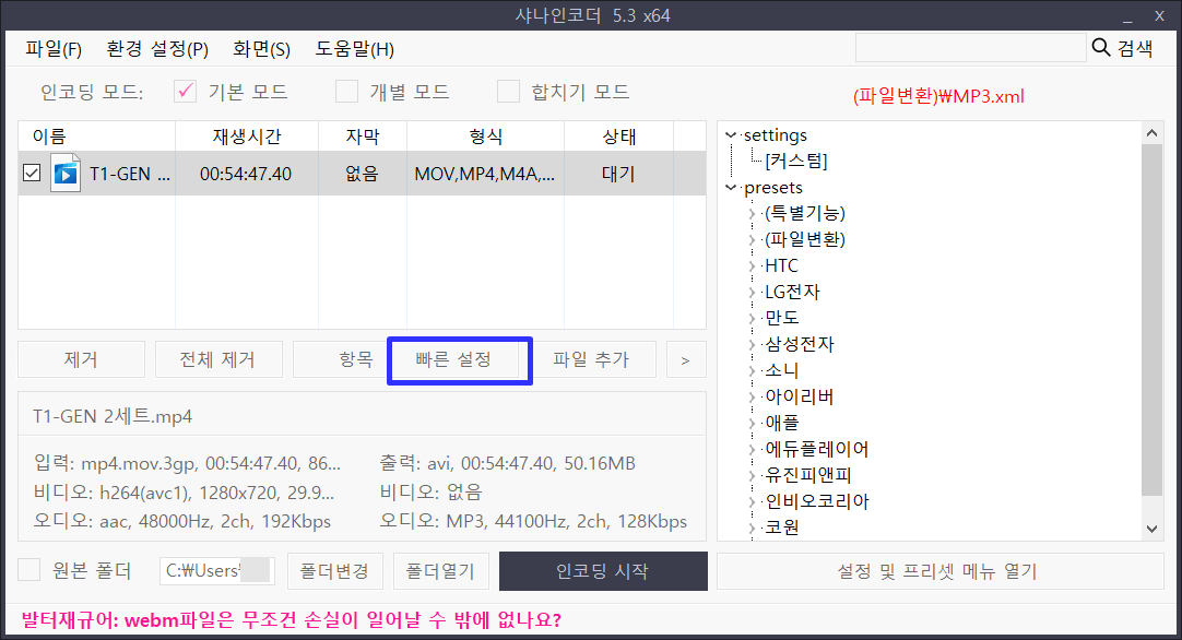 용량이 너무 클 경우도 이 프로그램을 이용해 적당한 용량으로 인코딩 할 수 있습니다.