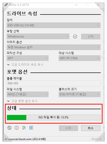 그럼 아래 [상태]부분에 ISO파일 복사 중 이라고 진행률이 표시됩니다!