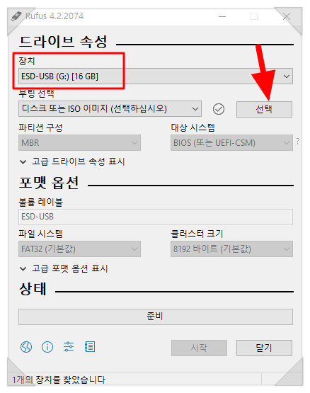 상단에 [장치]부분에 usb 메모리 선택되어있는지 확인합니다.