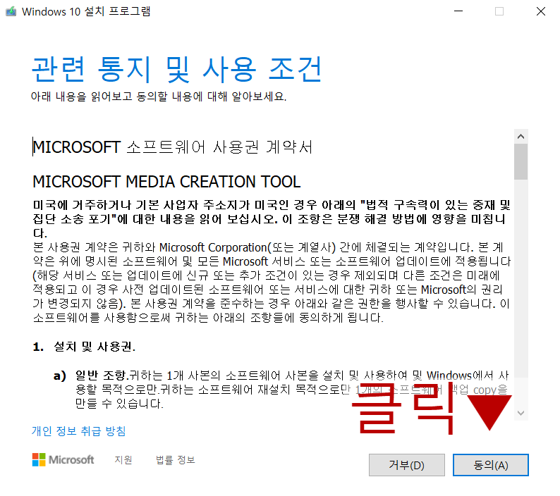'관련 통지 및 이용 조건' 화면 오른쪽 하단에 있는 '동의'를 클릭하세요.