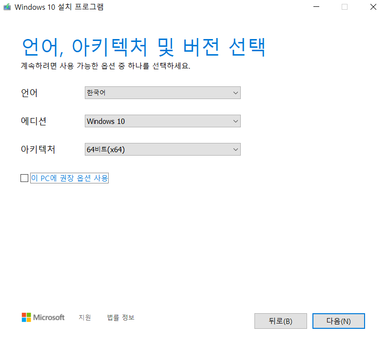 다른 버전의 윈도우10(예:윈도우10 홈 또는 프로)를 설치해야 하는 특별한 필요가 없다면 기본 설정을 그대로 두어야 합니다 . 그런 다음 '다음'을 클릭하세요.