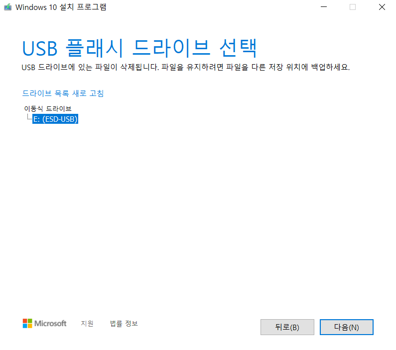 미디어 생성 도구는 사용하기로 선택한 모든 USB 드라이브 데이터를 완전히 지웁니다. 계속하기 전에 USB에 있는 중요한 파일을 백업하세요.