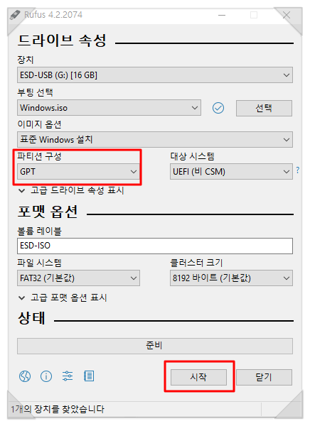 [파티션구성]부분에서 GPT를 선택하고