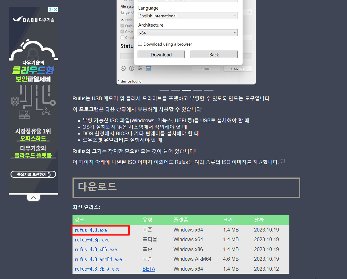 먼저, Rufus 홈페이지(https://rufus.ie/ko/)에서 최신 버전의 Rufus를 다운로드 받으세요.