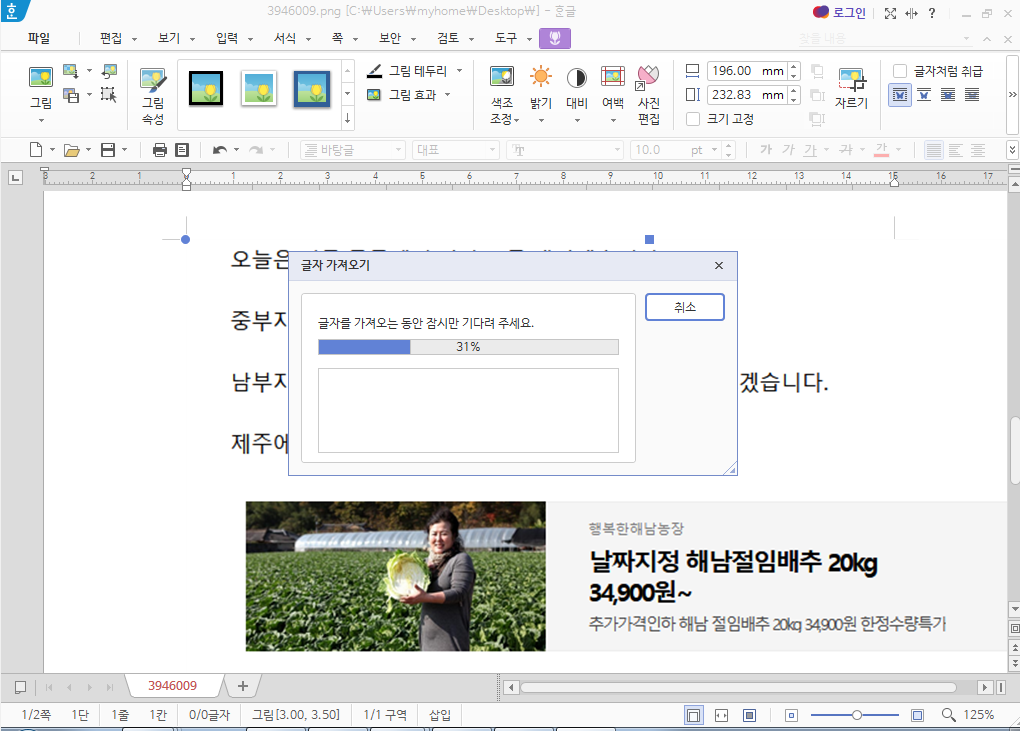 즉 스캔한 파일이나 캡쳐된 사진을 한/글에 붙여 넣은 후